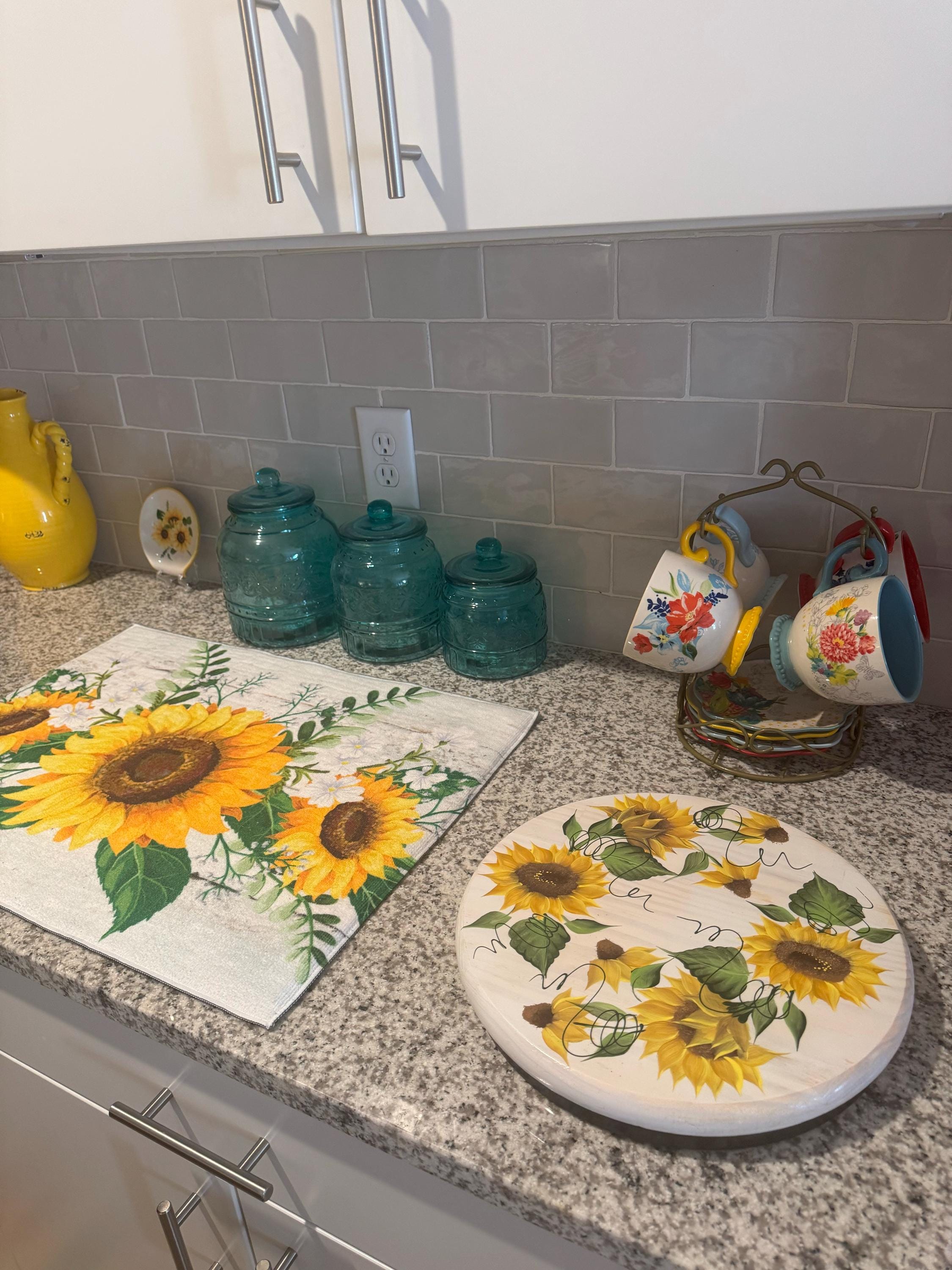 I love my hand painted sunflower (white) wood lazy susan. It’s very pretty and looks great with my sunflower decor.