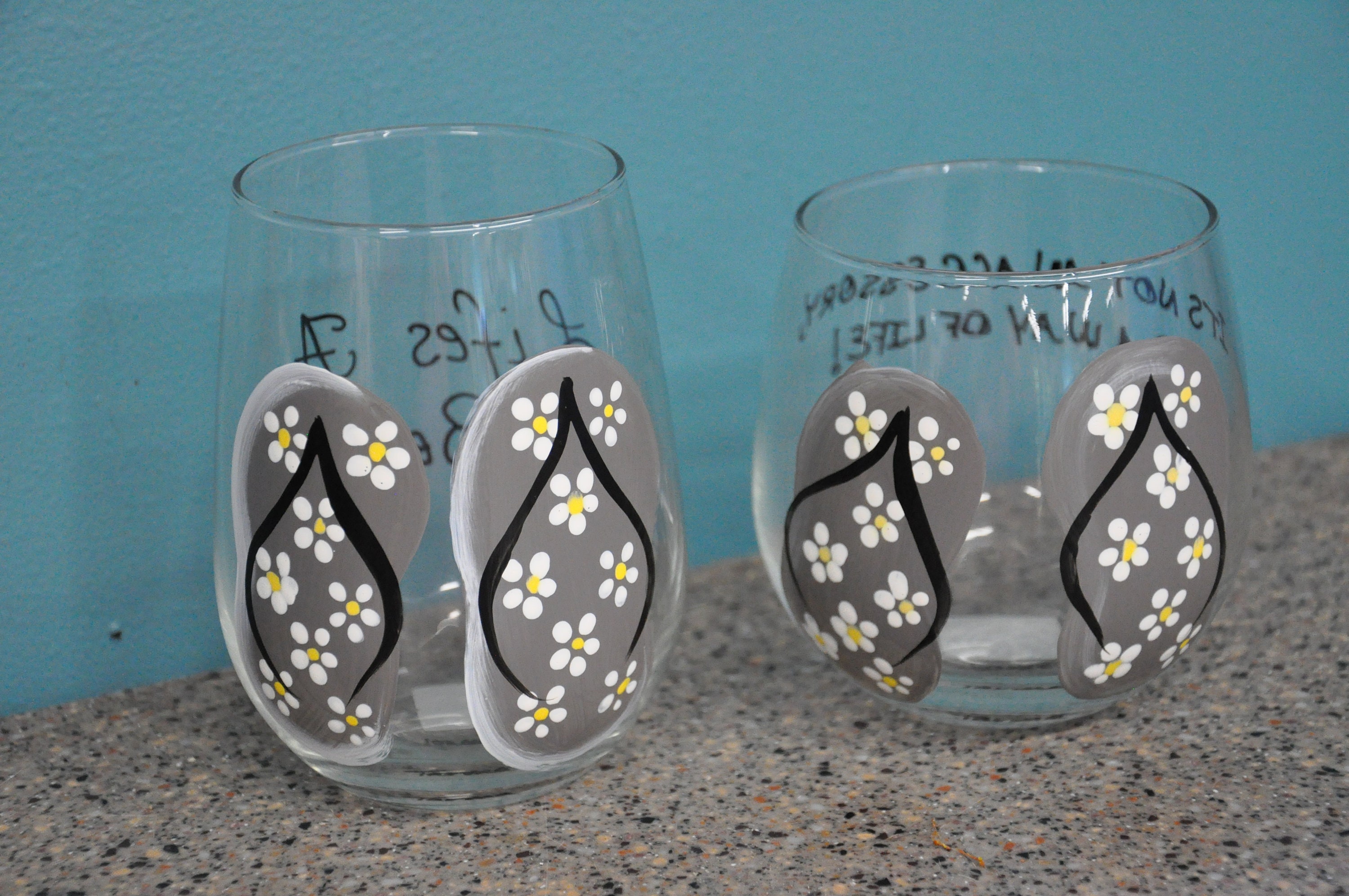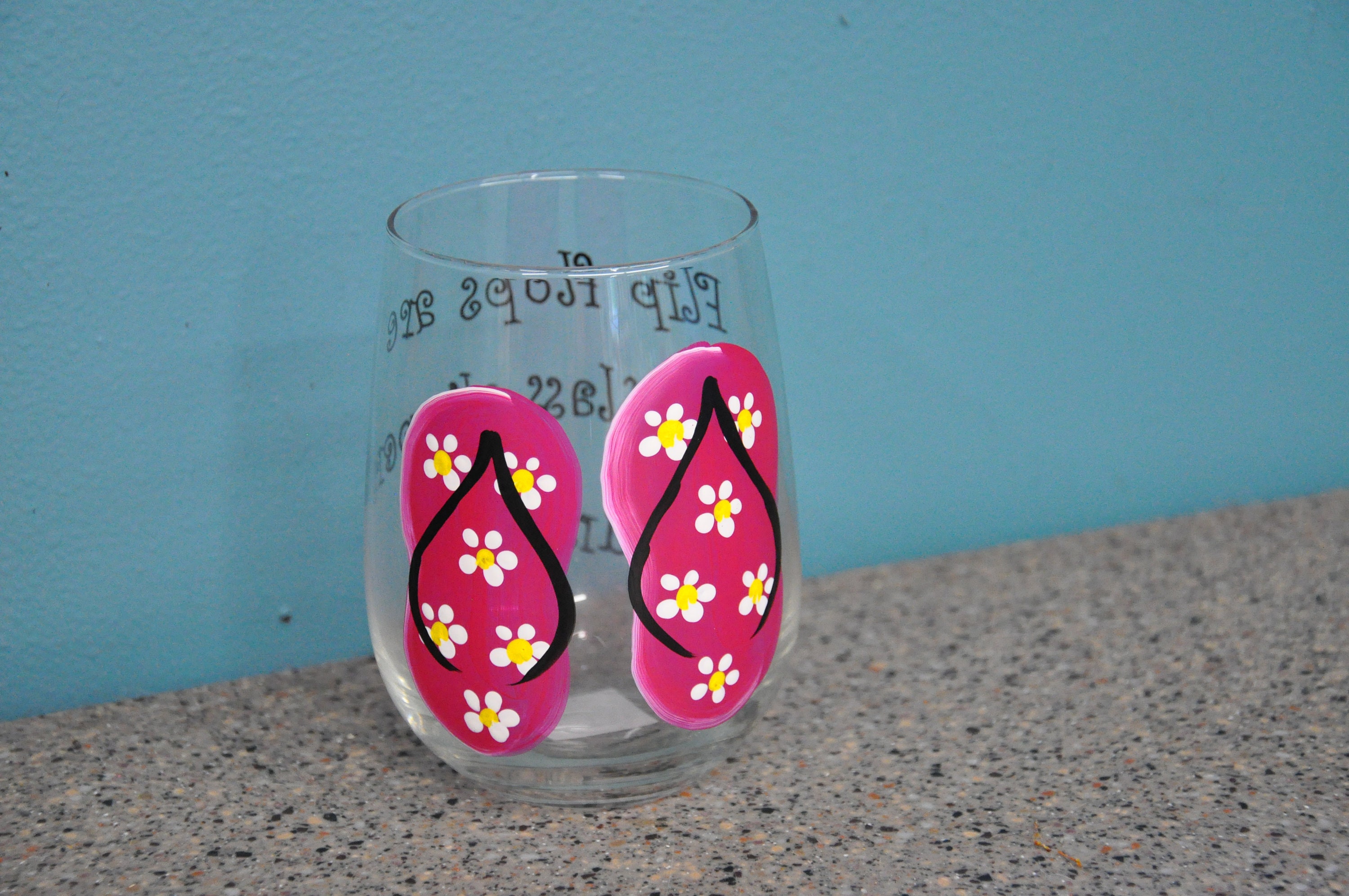 This listing is for a single, 16 oz. universal Libbey wine glass. Can be used or red or white wine. Design is a pair of flip flops, accented with white flowers & yellow centers on the front. On the back you can customize this by adding a phrase from my list or add your own.